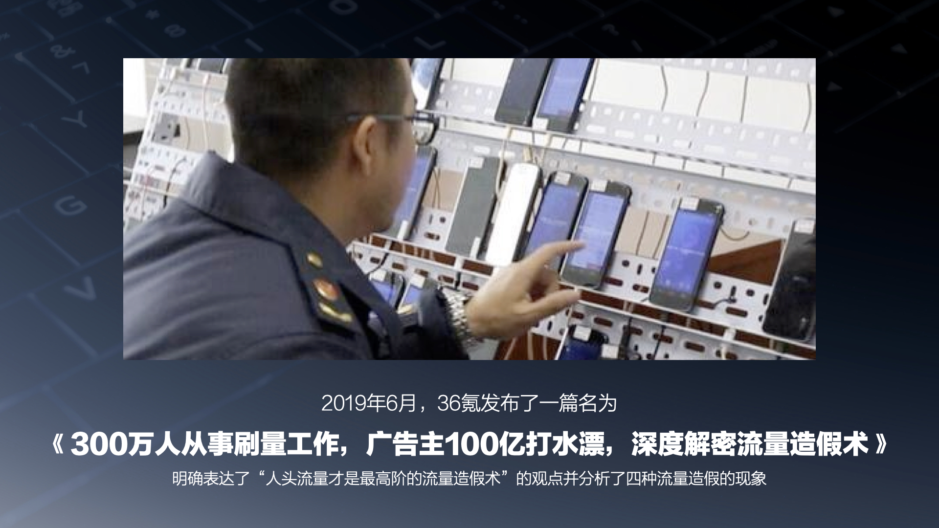 2019年6月,36氪发布了一篇名为《300万人从事刷量工作,广告主100亿打水漂,深度解密流量造假术》的文章,明确表达了“人头流量才是最高阶的流量造假术”的观点,并分析了四种流量造假的现象。