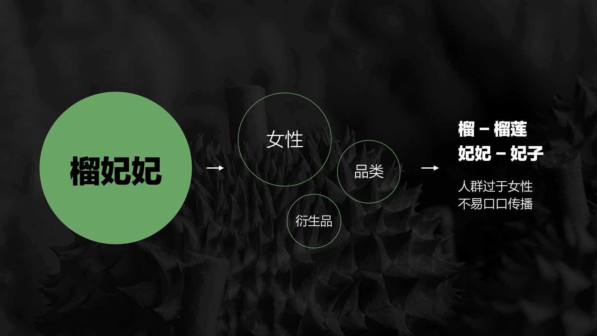 “榴啊牛”原名为“榴妃妃”,IP形象显示榴莲的外壳占到了大多数,品牌却主打果肉。此外,品牌名“榴妃妃”针对人群过于女性化,也不宜口口传播。