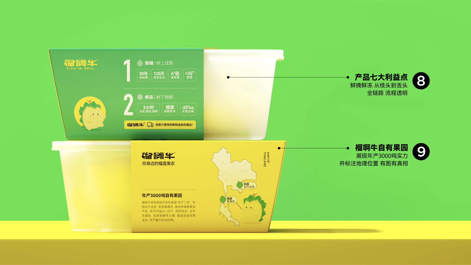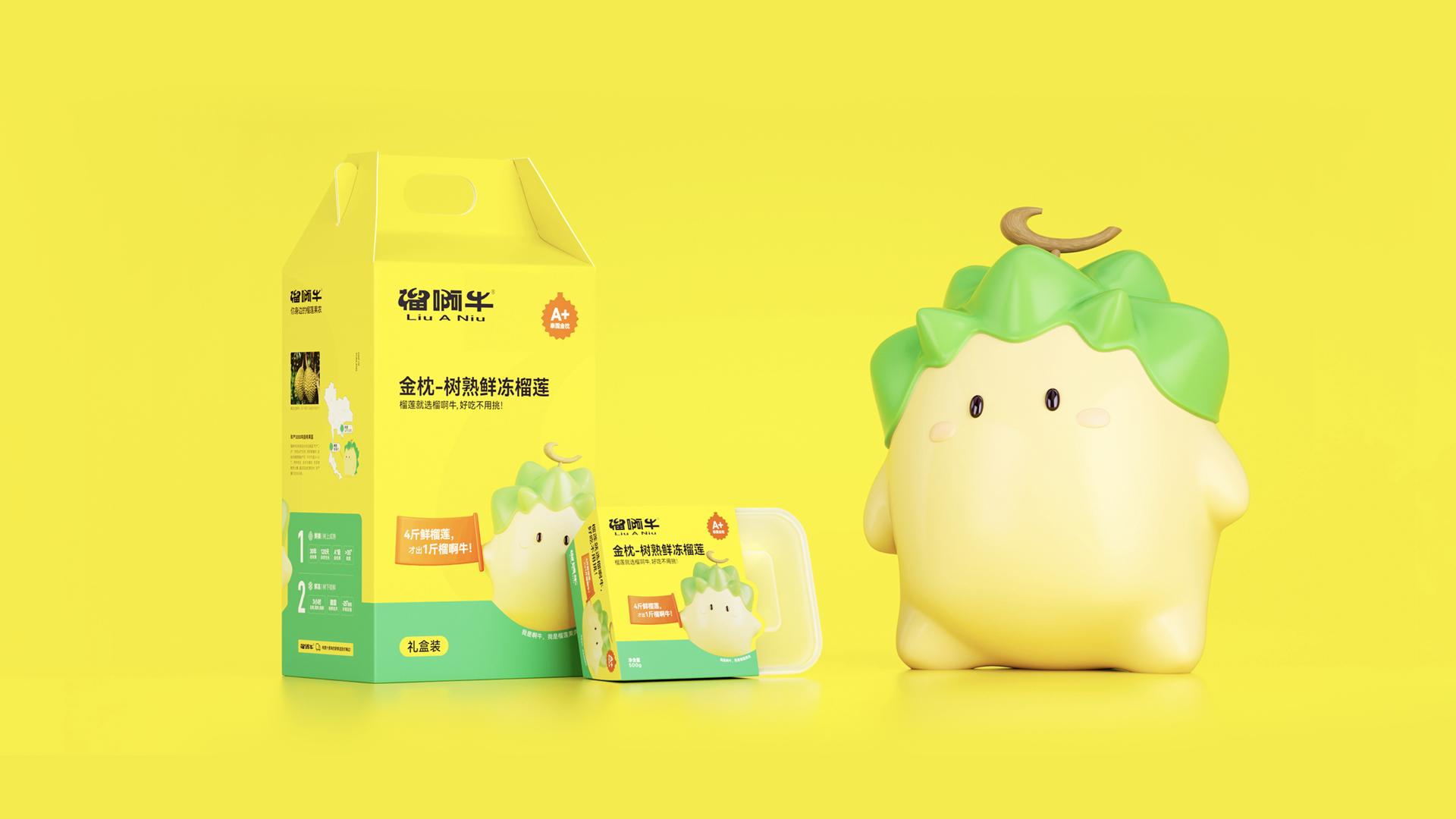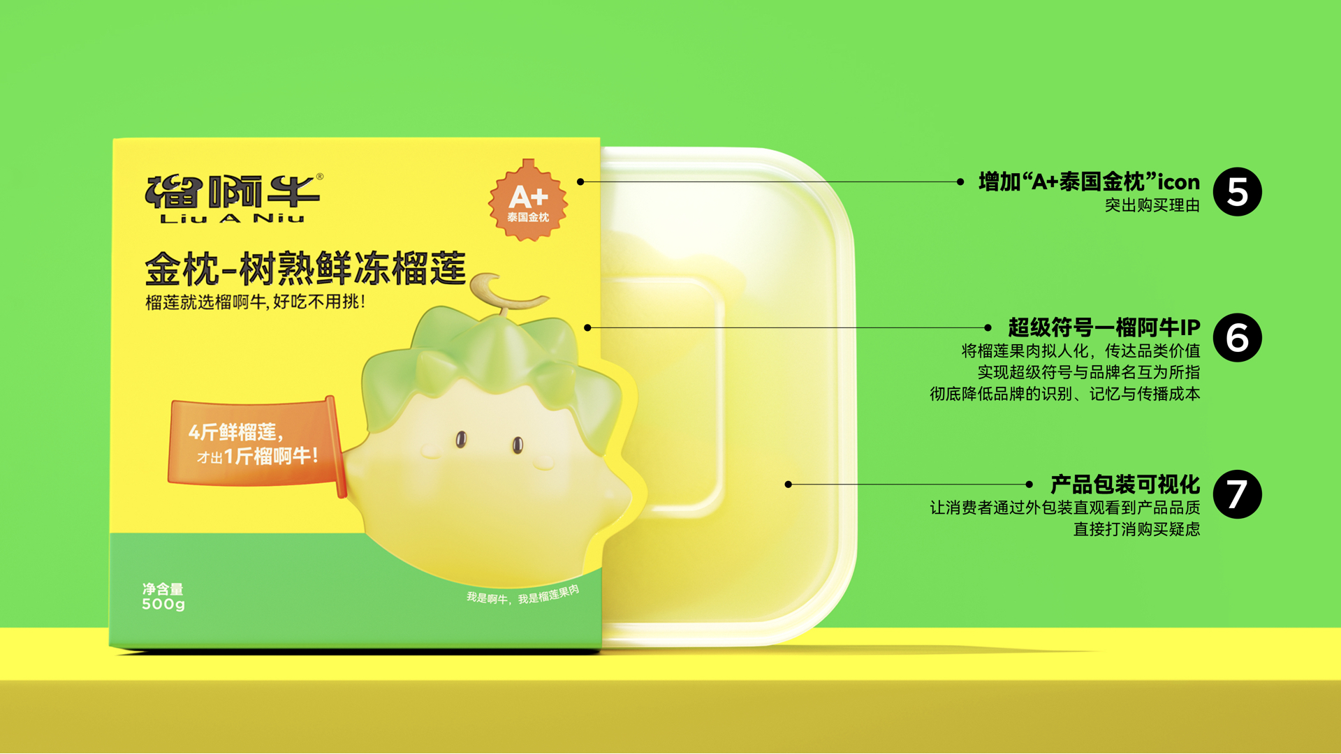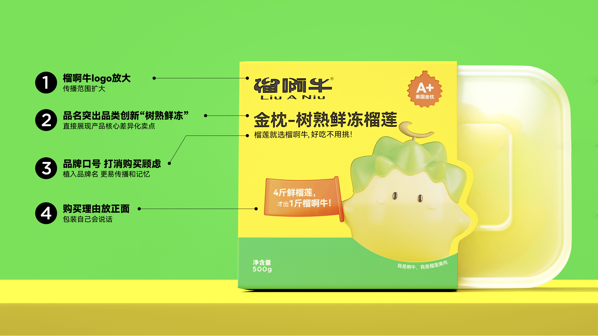 之后彬果为它挑选了一个新的品牌名“榴啊牛”。首先保留了榴莲的“榴”,一听听得懂;其次“啊牛”像一个果农的名字,记忆成本低;再者这个产品老少皆宜,本身没有属性。