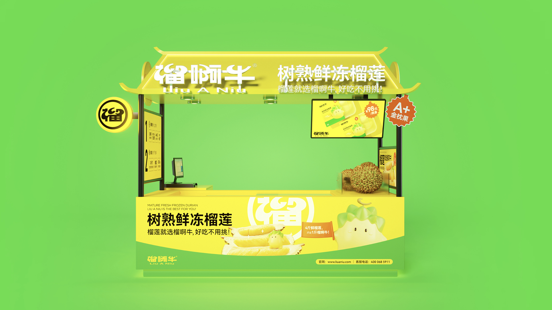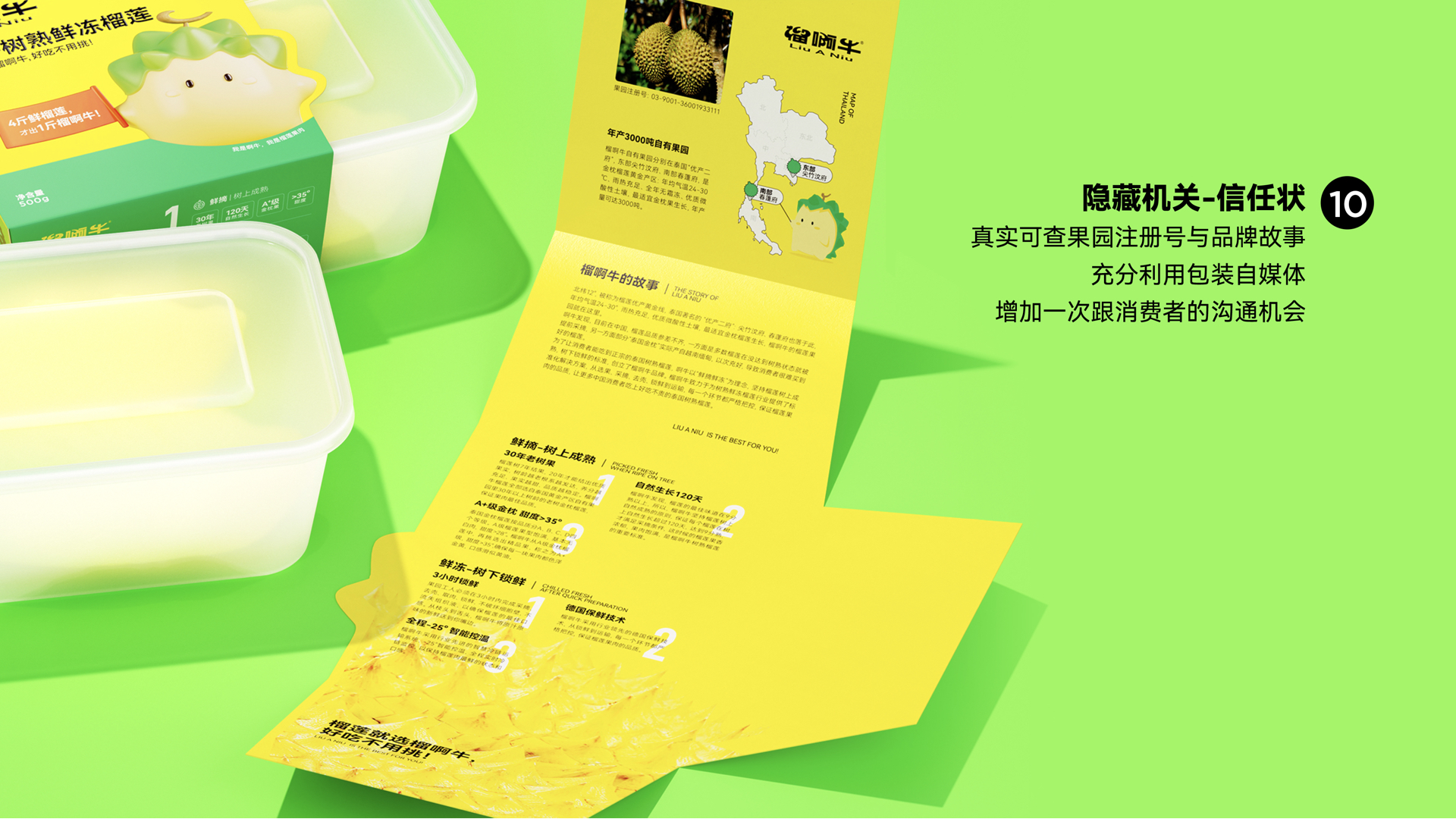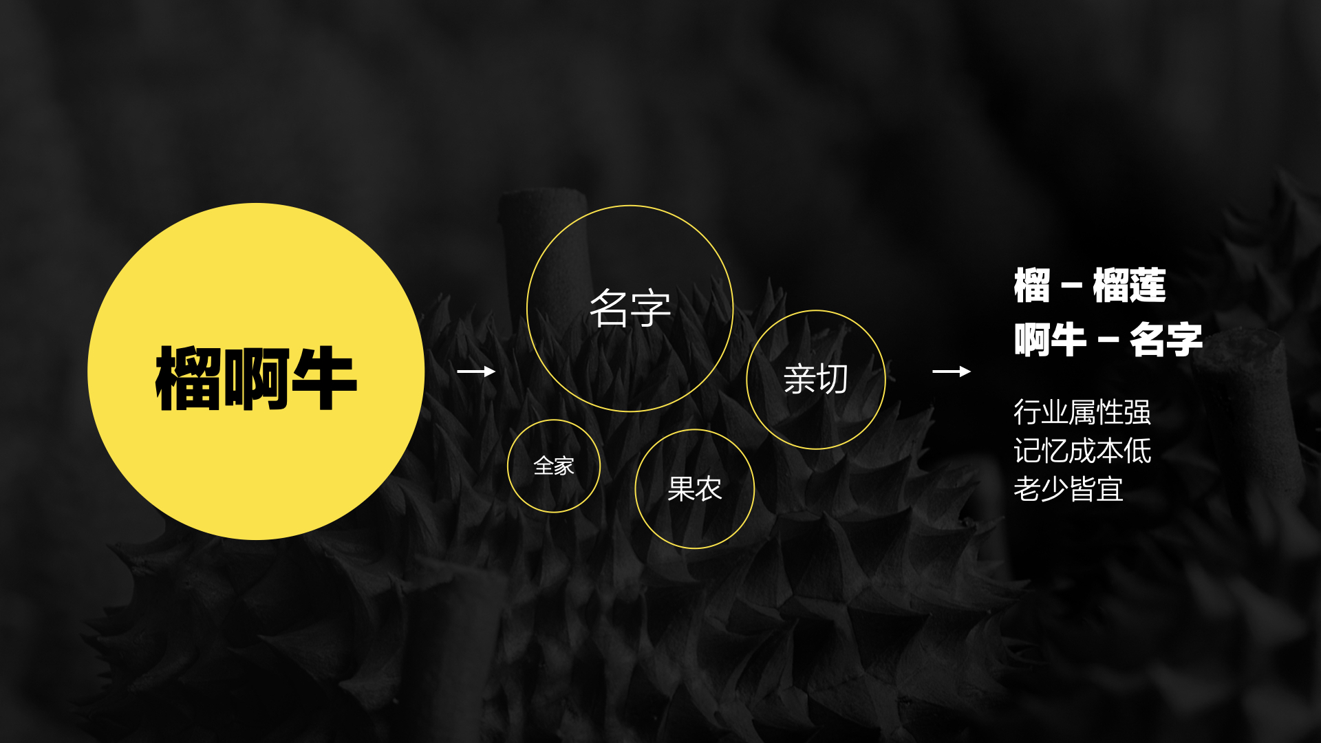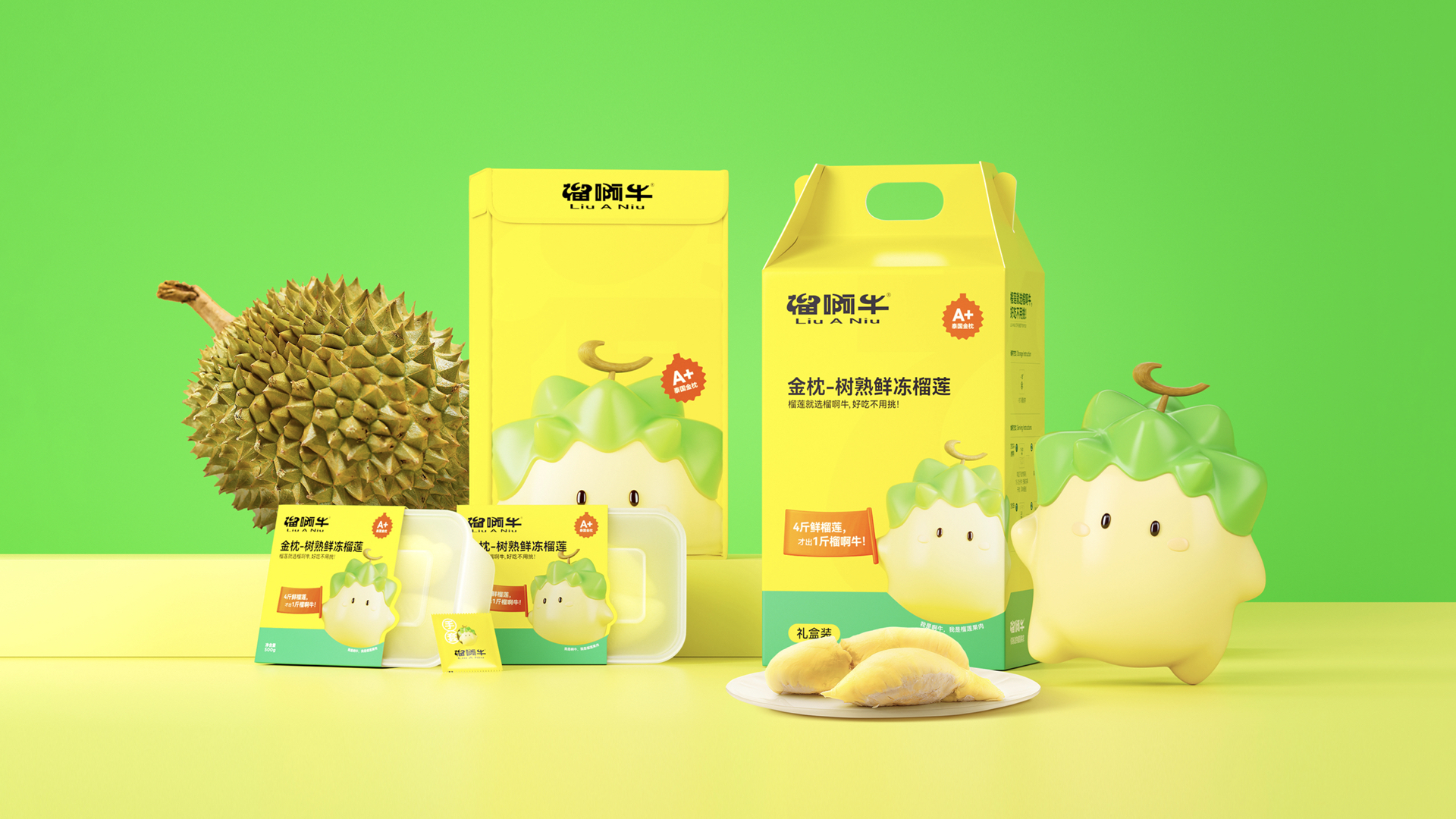 之后彬果为它挑选了一个新的品牌名“榴啊牛”。首先保留了榴莲的“榴”,一听听得懂;其次“啊牛”像一个果农的名字,记忆成本低;再者这个产品老少皆宜,本身没有属性。