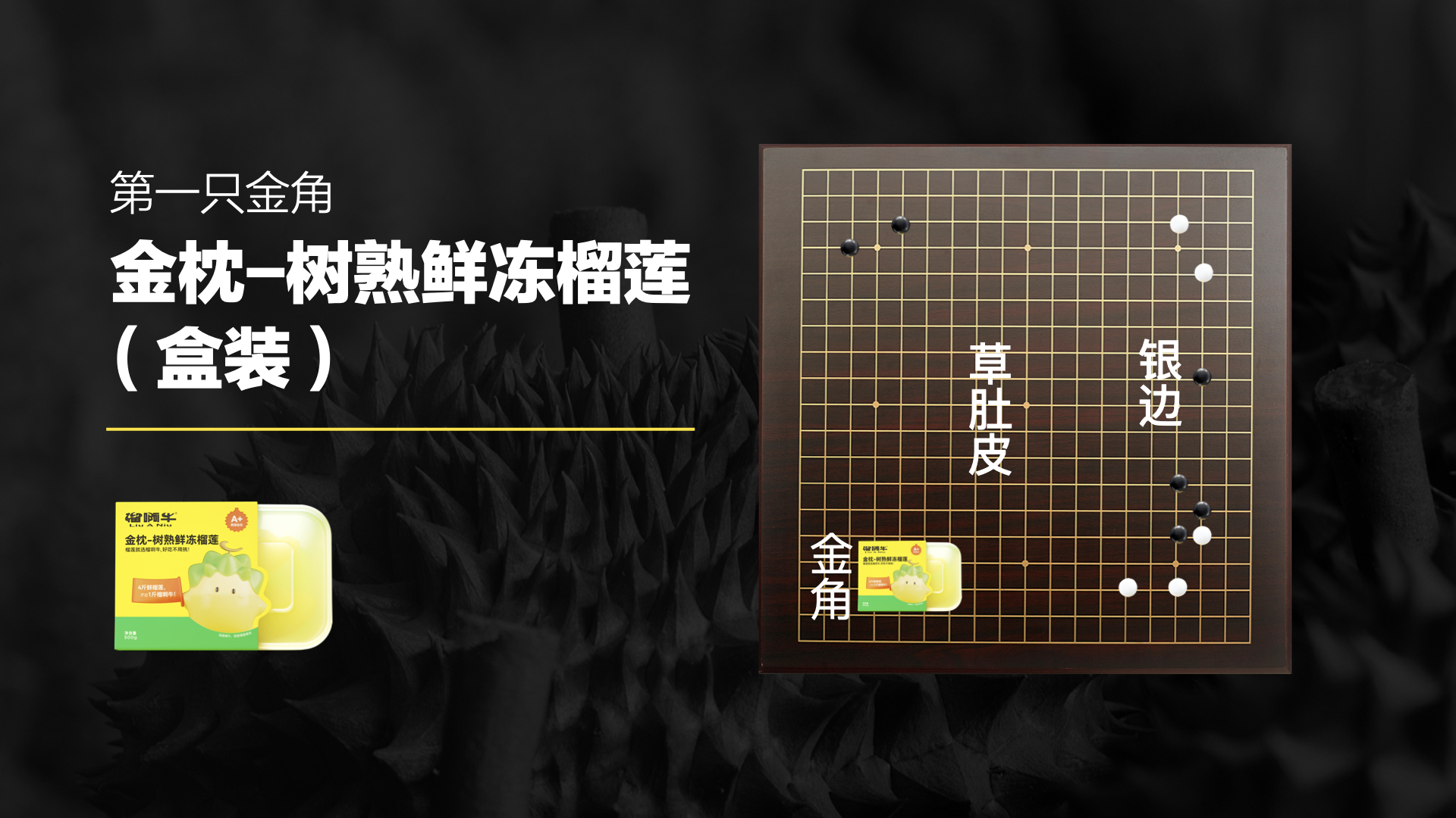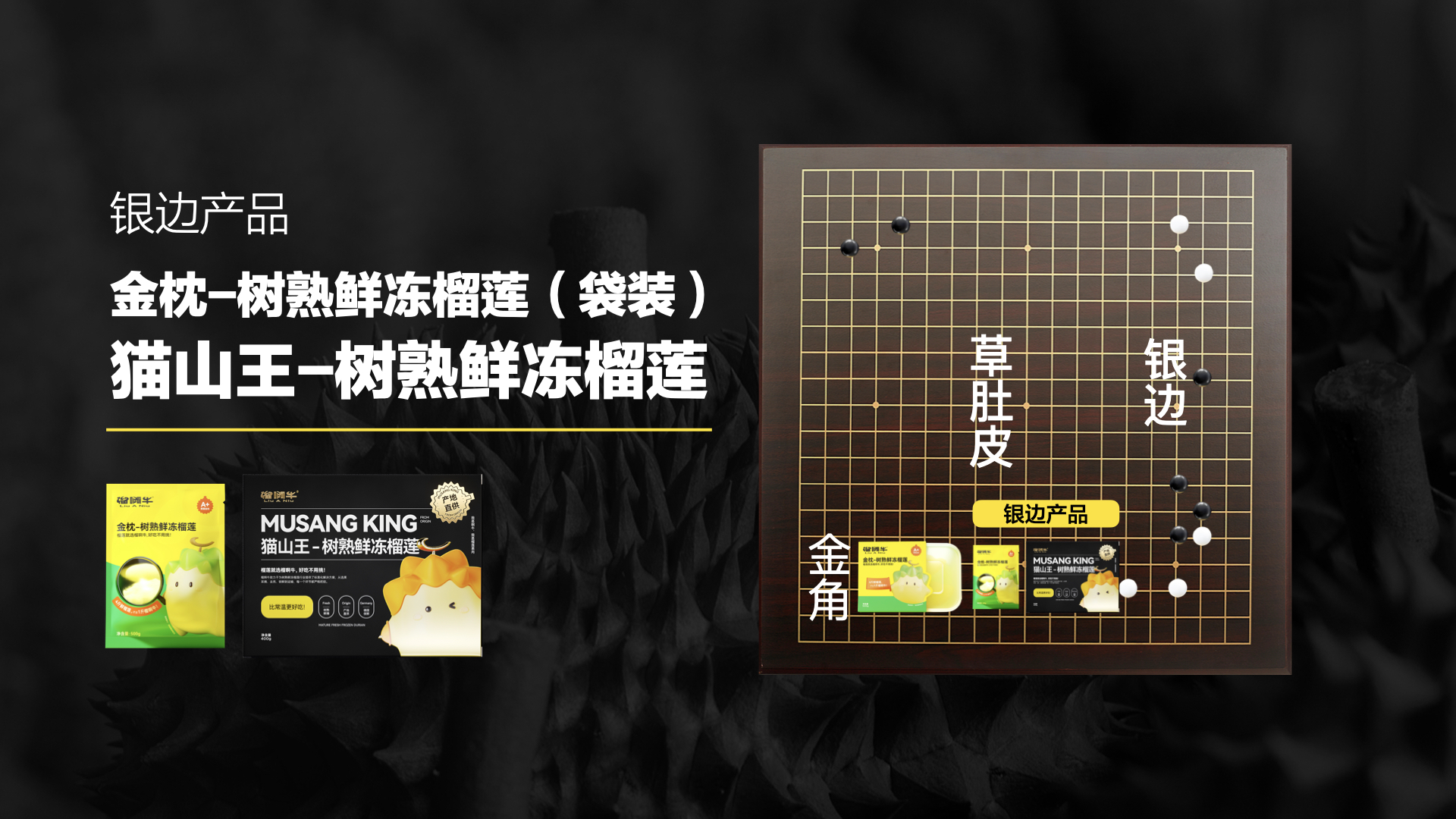 其一,我们延伸了几个不同的规格,做了一个袋装的金枕-树熟鲜冻榴莲,此外推出衍生产品,猫山王-树熟鲜冻榴莲。