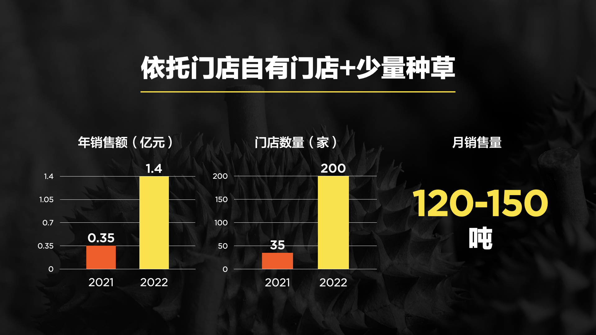 2022年,他们依托自有门店加少量种草,门店数量增长至近6倍,年销售额飙升至1.4亿元,根据月销售量,每月至少生产120-150吨的榴莲果肉,目前整体处于1-10的快速增长期。