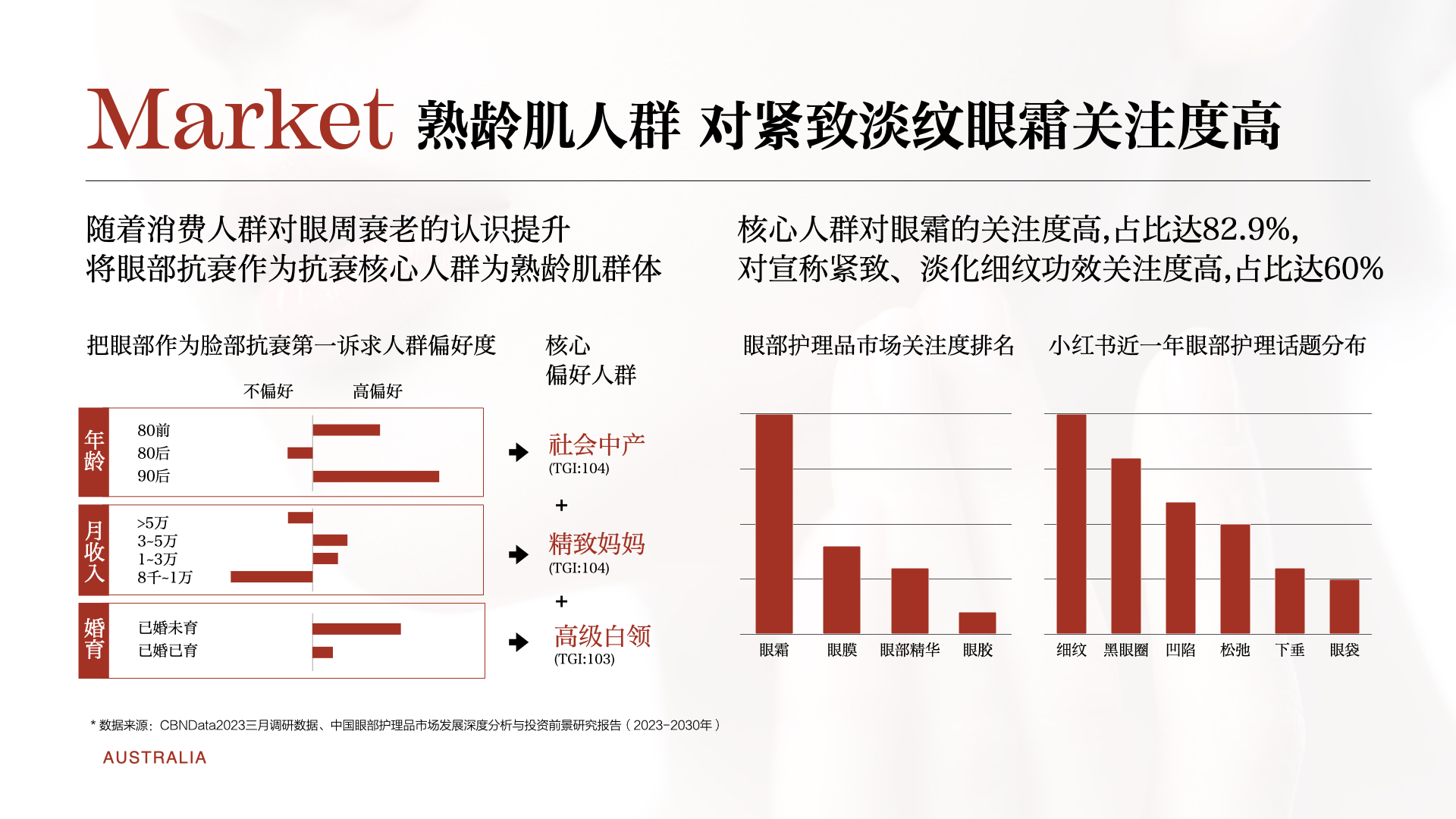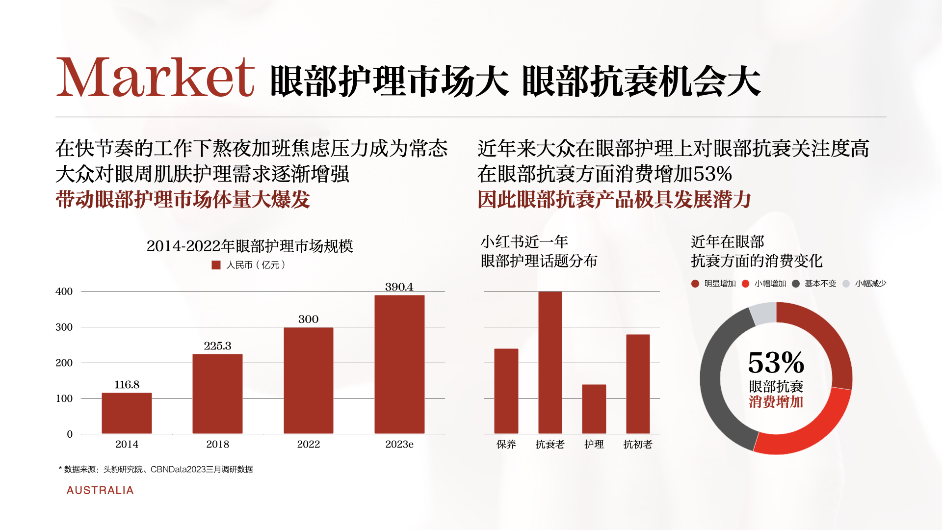 消费者对问题肌肤护理的需求日益增长,尤其是对于眼部肌肤的关注。随着生活节奏的加快和屏幕使用时间的延长,越来越多的人开始面临眼周肌肤问题,如黑眼圈、眼袋、细纹等。虽然市场上的眼霜品牌众多,但大多数产品的功能性和创新性都不强,消费者对此颇有微词。