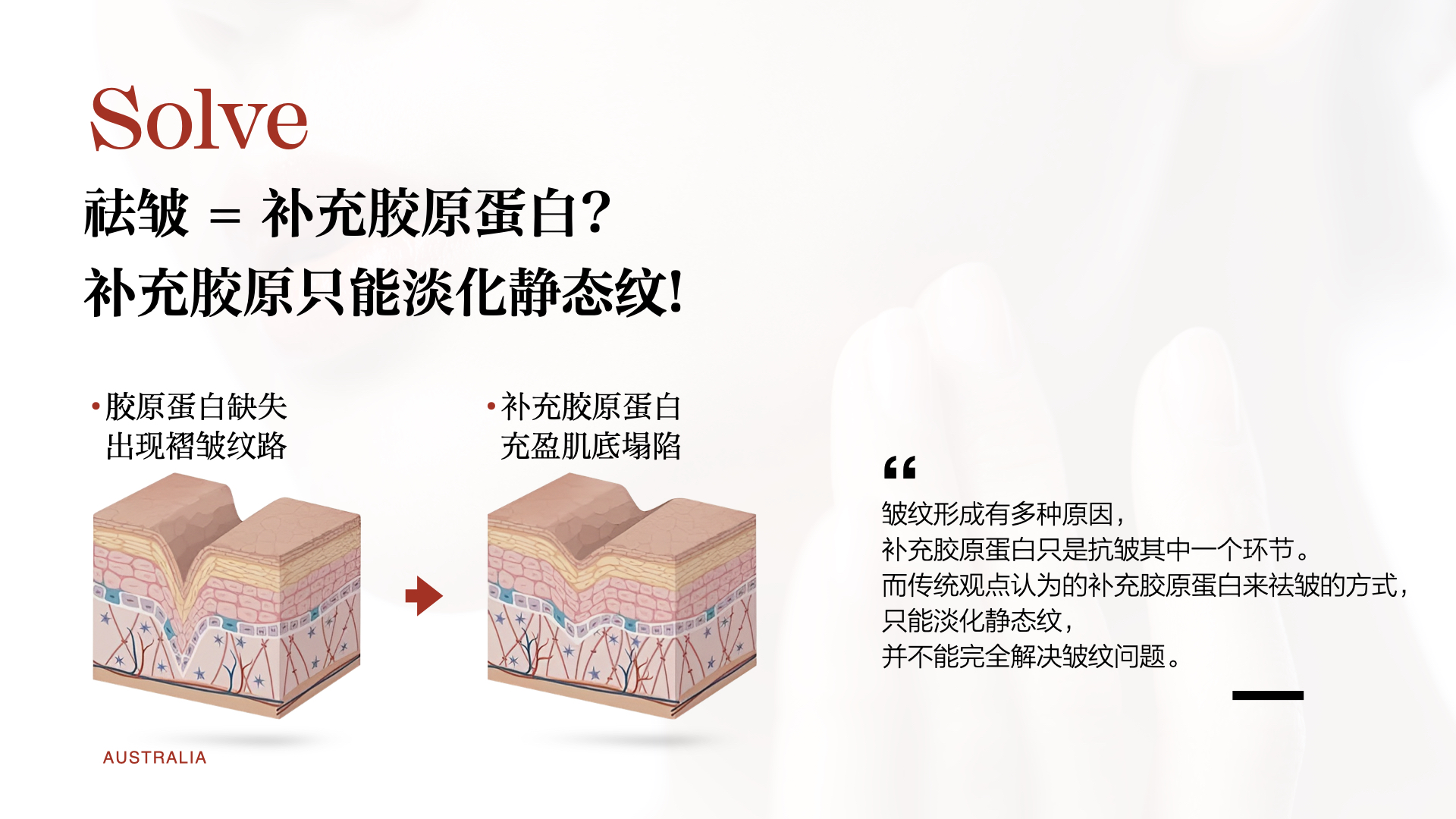 三、对于功效:传统观点认为的补充胶原蛋白来祛皱的方式,只能淡化静态纹,并不能完全解决皱纹问题。皱纹形成有多种原因,补充胶原蛋白只是抗皱其中一个环节!
