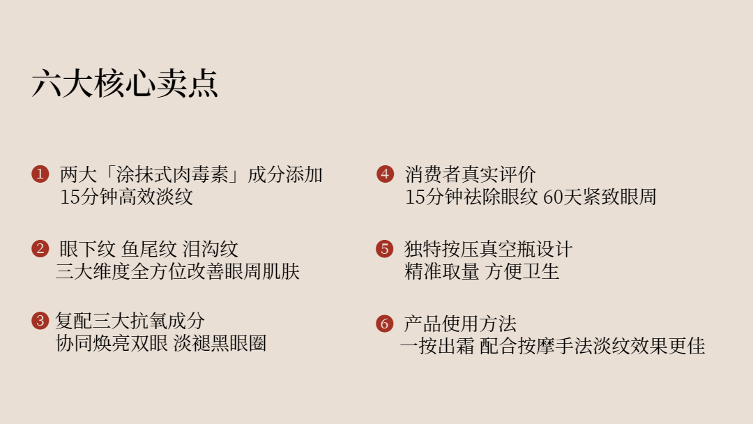 为了让产品能够以让消费者清晰易懂的销售语言传递给主播,彬果咨询在手册中整合梳理了产品6大核心卖点与4大适用的场景,便于主播自测试用与延展卖点。